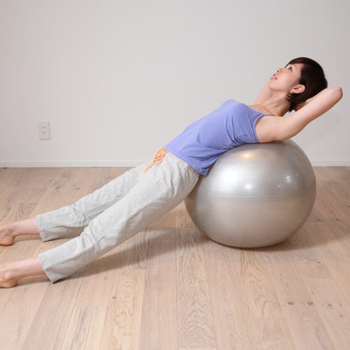背中にボールをあて、腹筋を行います。ボールを使うことで左右のバランスを意識しながらできます。両手を頭に持ってくることで、バランスを取ることが難しくなります。 応用としては、左右にひねってみましょう。腹筋の両サイドも鍛えられます