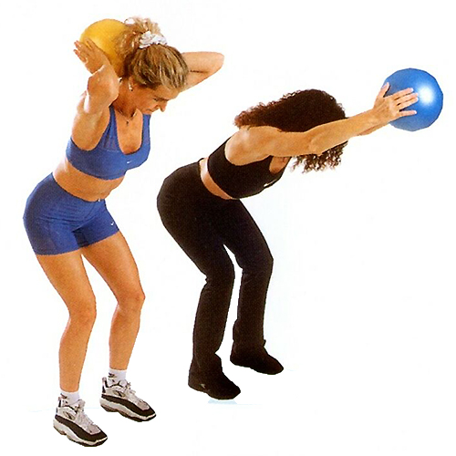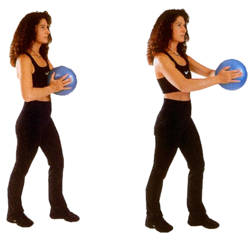 背筋を伸ばし、膝を少し曲げる。 約15秒間両手でボールを強く押す。 ボールを持ったまま腕を後ろに曲げたり伸ばしたりする。