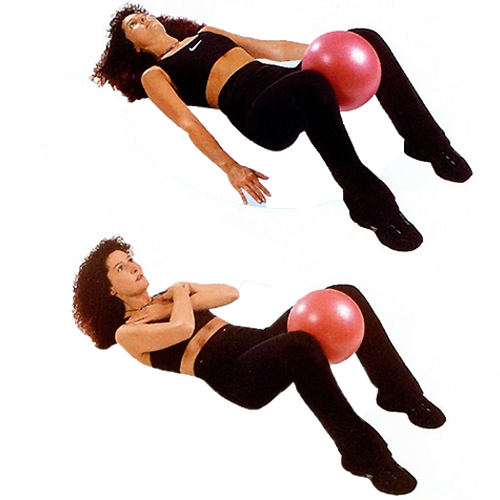 仰向けになって両膝でボールをはさみ、押したりゆるめたりする。 ※バリエーション 両腕を胸に置き、上半身を起こして上下させる。