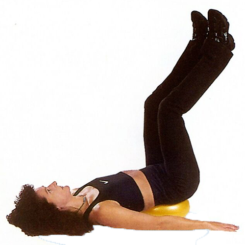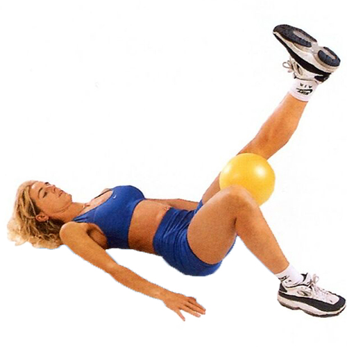 両足にボールをはさむ。ボールを回転させて左右交互に足を上げる。サポート用としてやわらかなボールを腰に置いて使う。