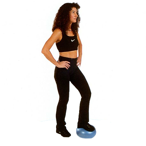 まっすぐに立ち、片足をボールにのせ、膝を少し曲げたままボールを押したりゆるめたりする。