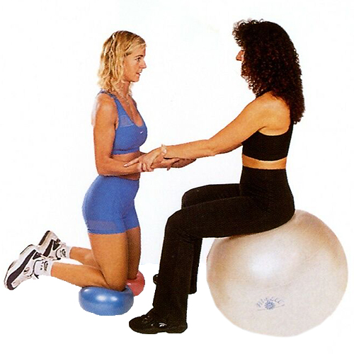 パートナーの助けを借りて、2個のボールの上にひざまずき、そっと床から足を離してバランスの良いところを探す。