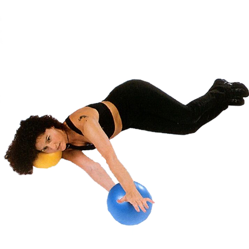 横になり両手でボールを支え、上の手をボールの上で転がし方を回す。 決して腰や骨盤を回さないように!