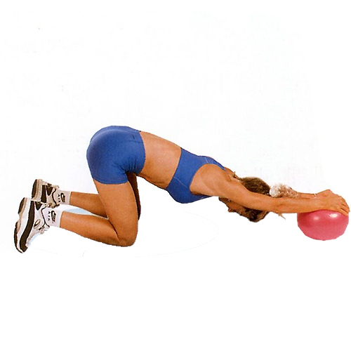 腰の位置を一定に保ち、手首をボールの上に乗せて少し前へ転がす。 <バリエーション>肩を床に向かって左右交互に押す。