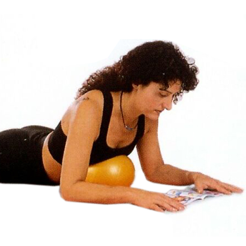 腰の下にボールを置き、すべての方向に少し動かして、ちょうどバランスの良い中心の位置に戻る。 <バリエーション>ボールの上で両手両足の力を抜き、リラックスする。